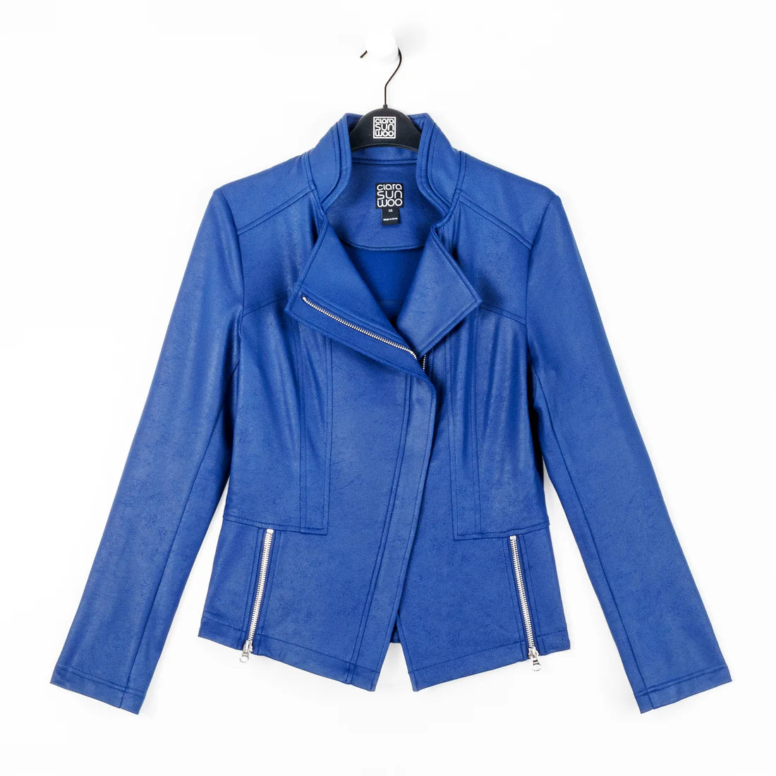 Let our faux Liquid Leather Signature Jacket pour all over you as it is made from our beautiful signature stretch knit, lightweight soft "lambskin feel" fabric with an antique-like matte finish. This jacket features a notched lapel with upright collar, long sleeves, a silver asymmetrical zip closure, faux pocket zipper slits, and complementary detailed front and backstitching.